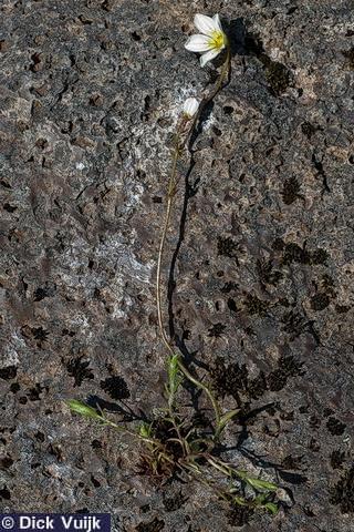 a tuft of the Mossy Saxifrage with flowering stem laid bare on a rock - Click for Full Size Image